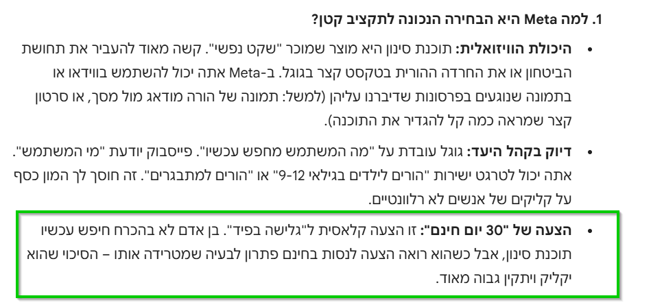 לעומת זאת, אם אני אדגיש שמדובר בפרסום של מוצר במבצע, ההצעה תהיה שונה : גוגל בעדיפות ראשונה ומטא בשנייה. Gemini גם מכוון אותי לחפש קודם כל אם יש נפח חיפוש מספיק למילות המפתח האלו.