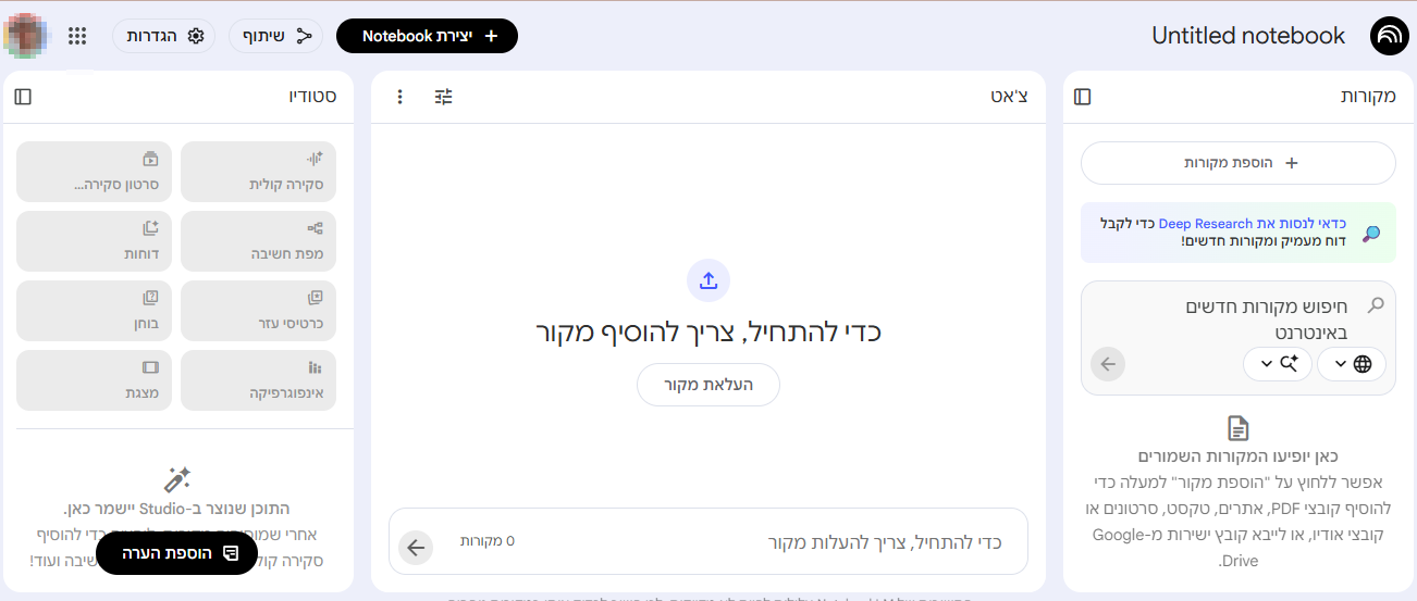 Notebook LM משמש בתור ספריה וירטואלית אליה אתם יכולים "לזרוק" קבצים שונים, אתרי אינטרנט, סרטונים, קבצים של Google Drive או סתם טקסט שהעתקם מהאינטרנט.