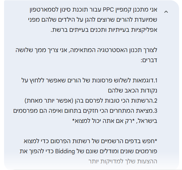 וכאן בדיוק נכנס התפקיד של ה-AI: הנה דוגמה לפרומפט לאסטרטגיית שיווק עבור "תוכנת סינון לסמארפטון": (לשיחה המלאה)