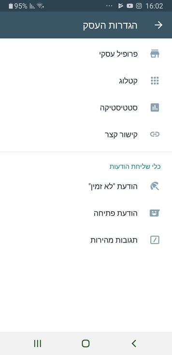 את הפרופיל העסקי מגדירים לאחר התקנת האפליקציה והאימות של מספר הטלפון. ניתן לערוך אותו שוב בכל שלב באמצעות לחיצה על שלושת הנקודות בצד שמאל למעלה וכניסה להגדרות :